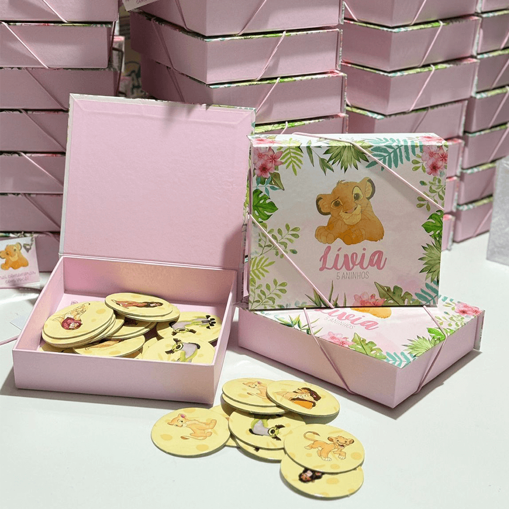 O Jogo da Memória (12 pares) é produzido em material cartonado rígido, com acabamento impecável, garantindo que as peças sejam duráveis. É apresentado em nossa Caixa de Jogos, 100% personalizada no tema da sua festa (como o tema ‘Maria Júlia’ da foto).
