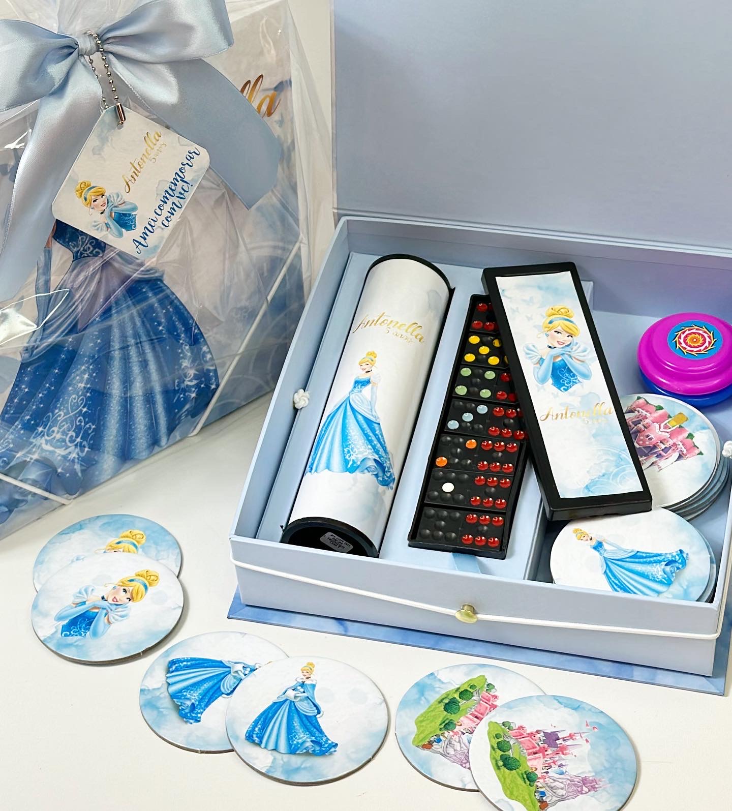 A Caixa de Jogos Quadrada (22x22x5cm) vem recheada com três jogos clássicos, todos personalizados no tema da sua festa: Jogo da Memória, Dominó, e Pega Vareta.