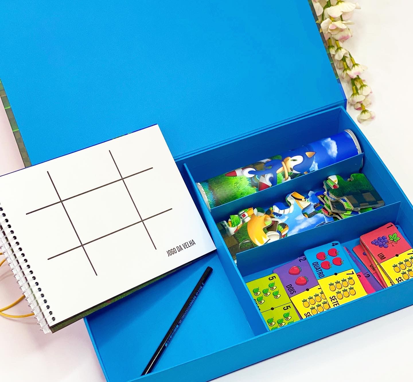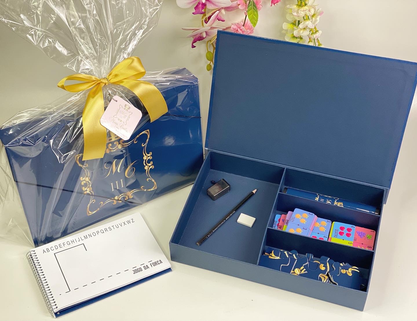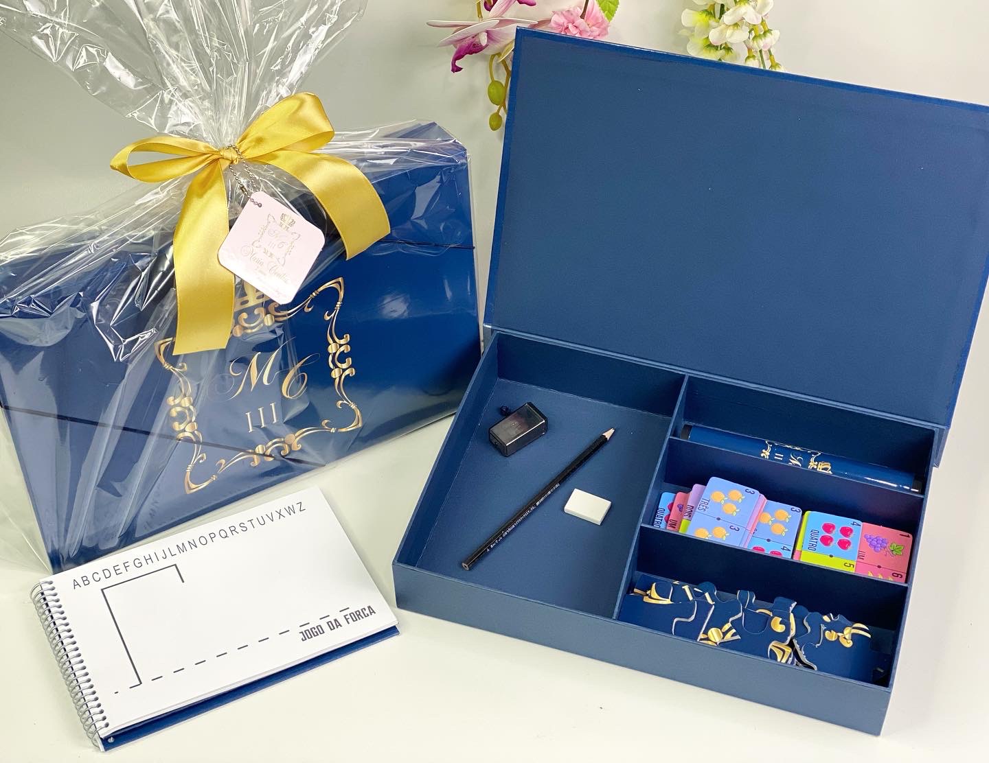 Esta é a nossa Opção 1. A Caixa Master (35x23x5,5cm) vem recheada com um kit completo de jogos e papelaria. É uma lembrança sofisticada para crianças mais velhas ou um brinde corporativo criativo.
