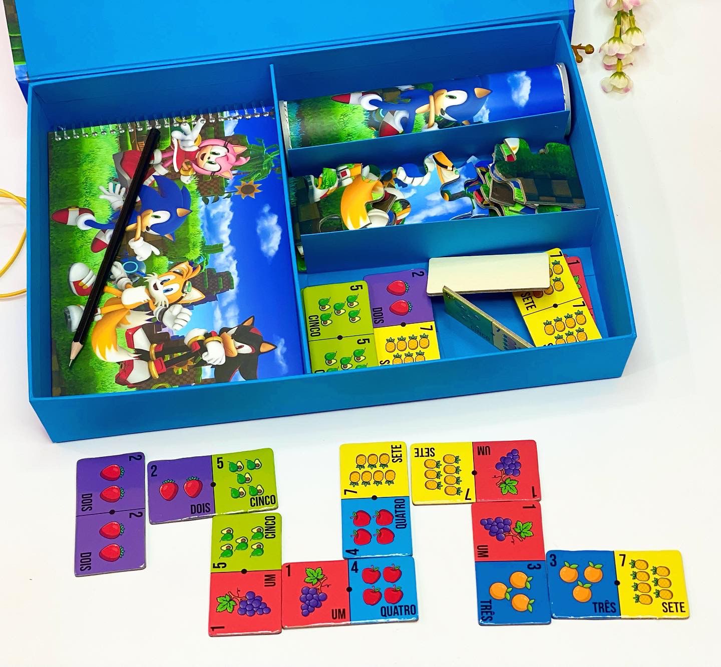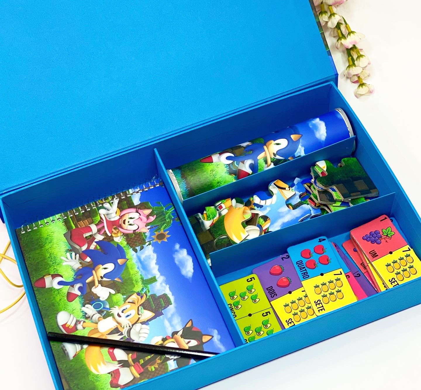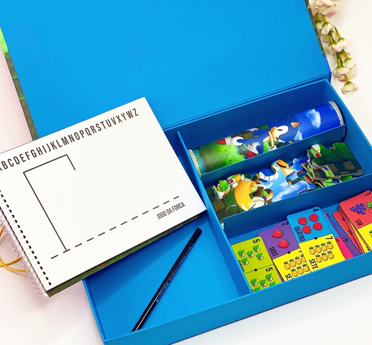Esta é a nossa Opção 1. A Caixa Master (35x23x5,5cm) vem recheada com um kit completo de jogos e papelaria. É uma lembrança sofisticada para crianças mais velhas ou um brinde corporativo criativo.