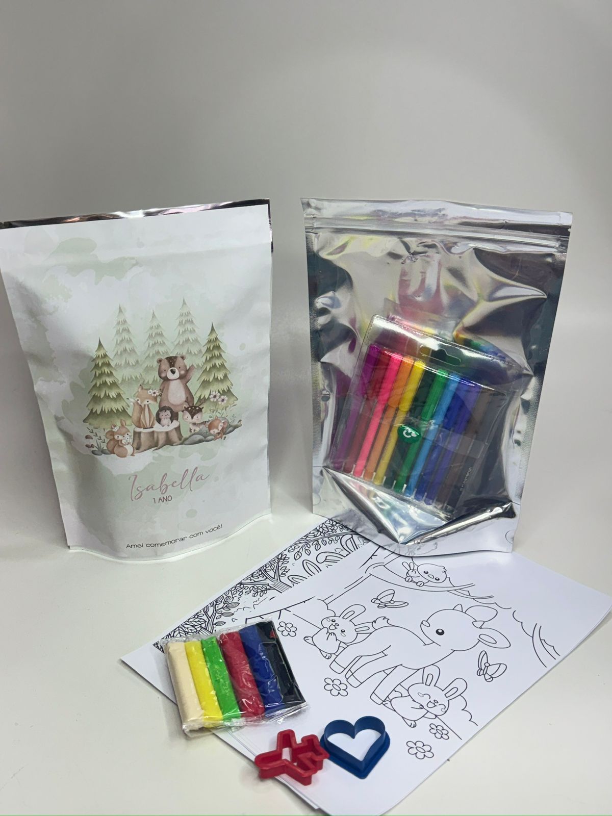 Em um Saquinho ZIP (30x20cm) 100% personalizado, unimos as duas atividades favoritas das crianças: colorir(com Gizão e desenhos) e modelar (com massinha e forminhas).