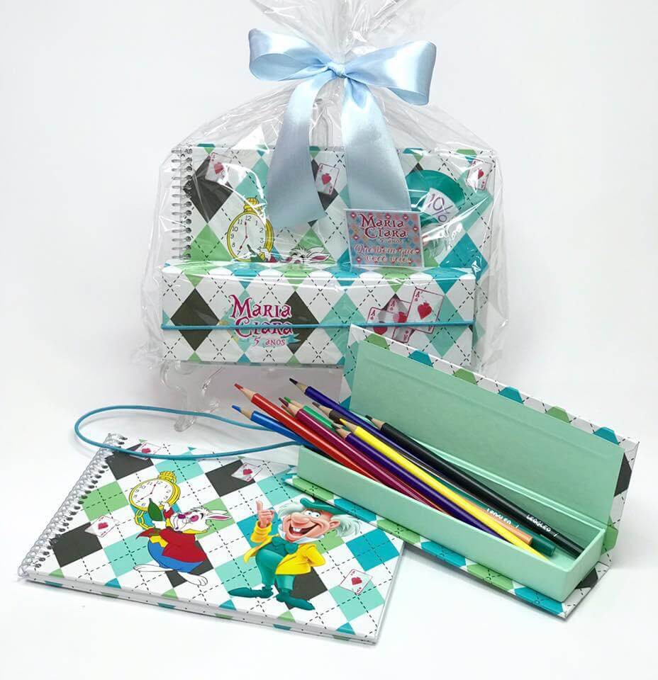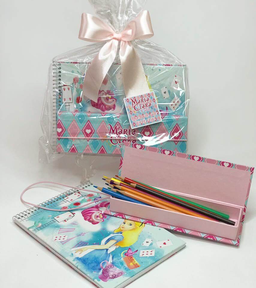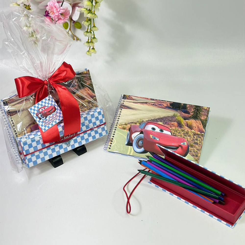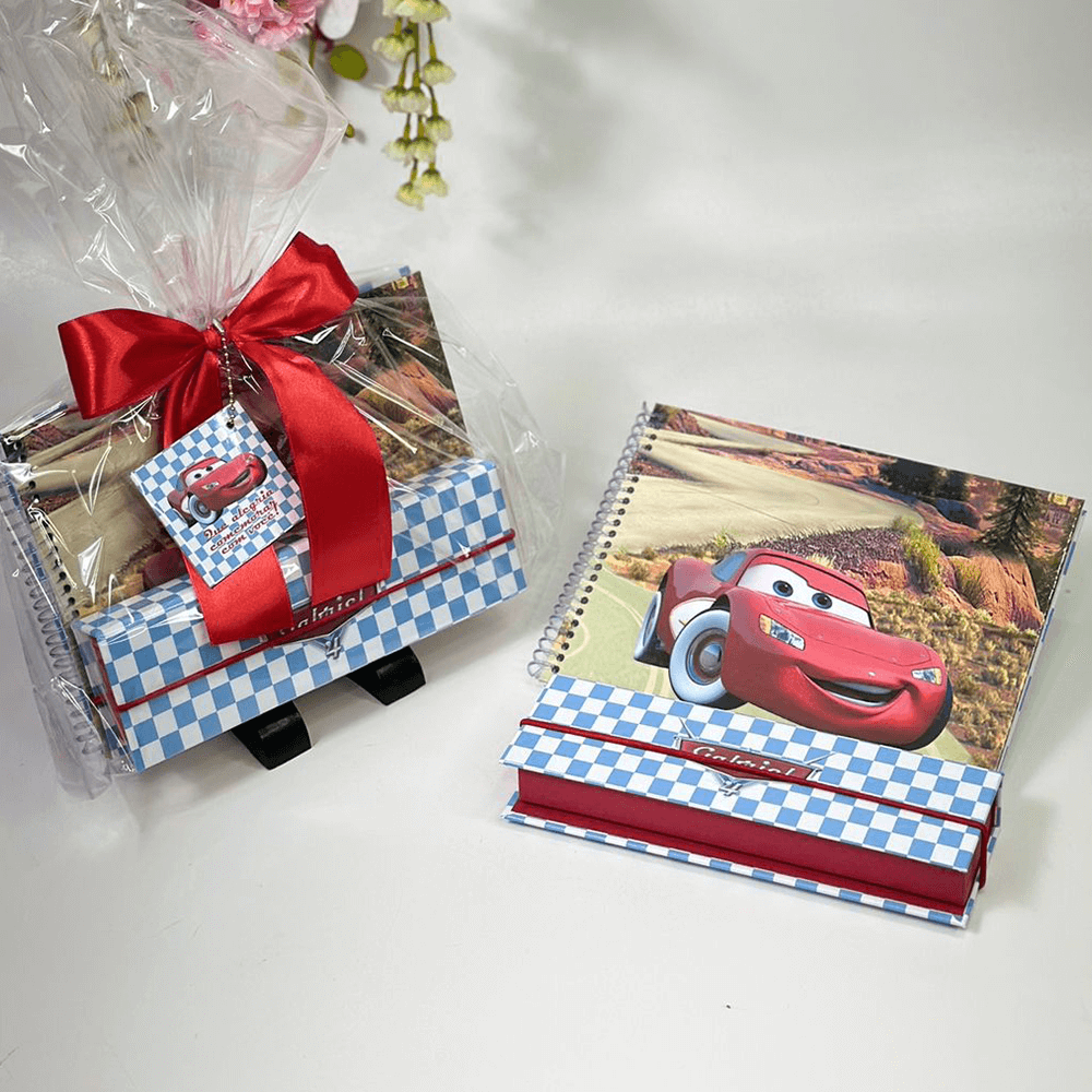Este kit é composto por dois itens separados de alta durabilidade: um caderno e um estojo, ambos produzidos em cartonagem rígida (capa dura). É a escolha perfeita para quem busca uma lembrança que será guardada e usada pela criança por muito tempo.