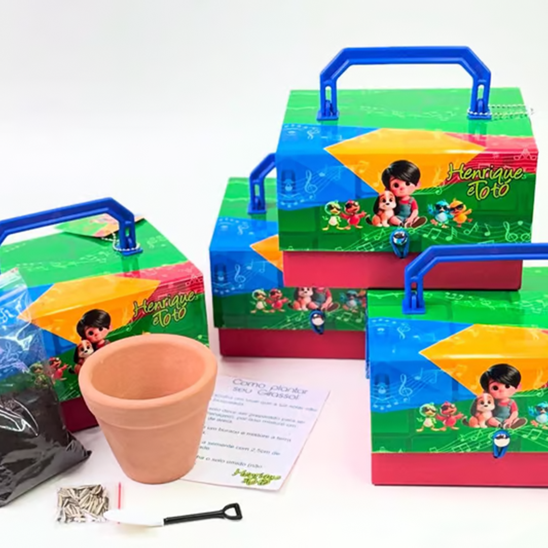 Nossa maleta é produzida em cartonagem de luxo, 100% personalizada no tema da sua festa, e já vem completa com tudo o que é necessário para começar a plantar.
