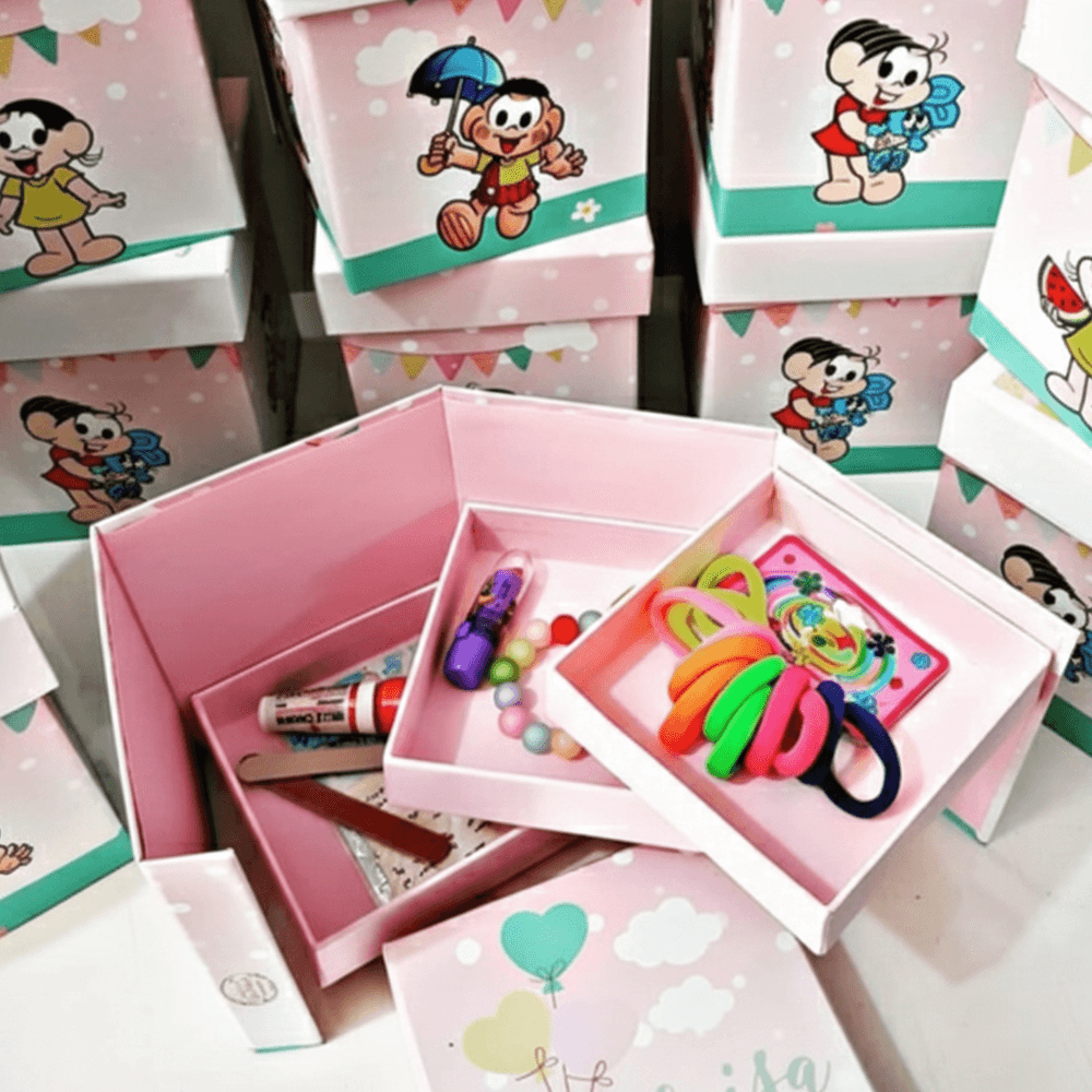 Este kit utiliza a nossa Caixa Cartonada de 3 Andares (Maleta Gaveteiro), o que a torna um presente funcional e de grande impacto. A caixa é 100% personalizada com o tema da festa e é recheada com itens variados de papelaria, canetas fofas e pequenos mimos.