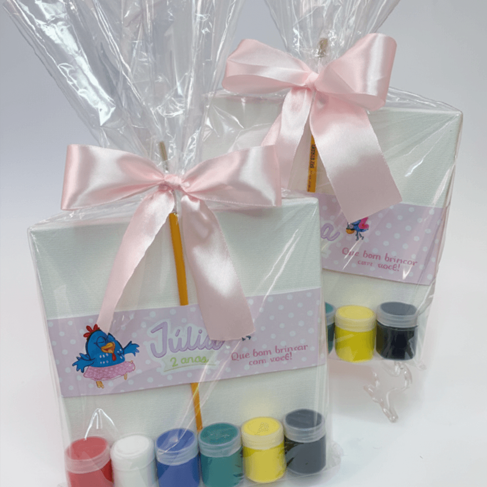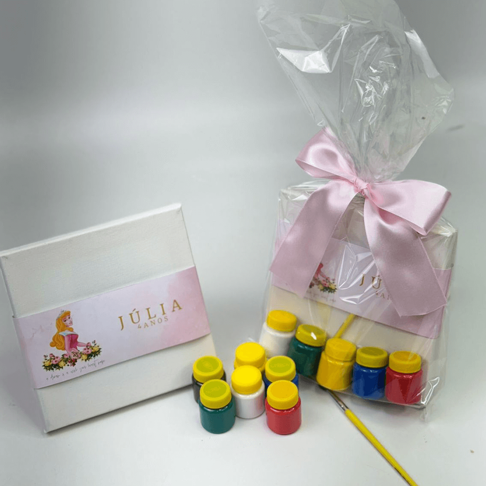O kit é composto pela Tela de Pintura 15×15, 6 potinhos de Tinta Guache e 1 Pincel. É uma lembrança criativa e prática, pronta para a diversão.