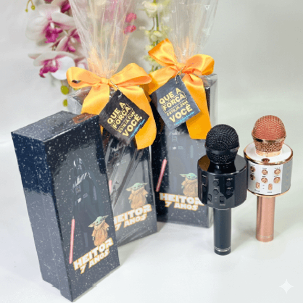 Este kit combina o sucesso do Microfone Karaoke (sem fio) com a apresentação sofisticada da nossa Caixa Cartonada (estrutura rígida), 100% personalizada por nós (como o tema “Star Wars” da foto).