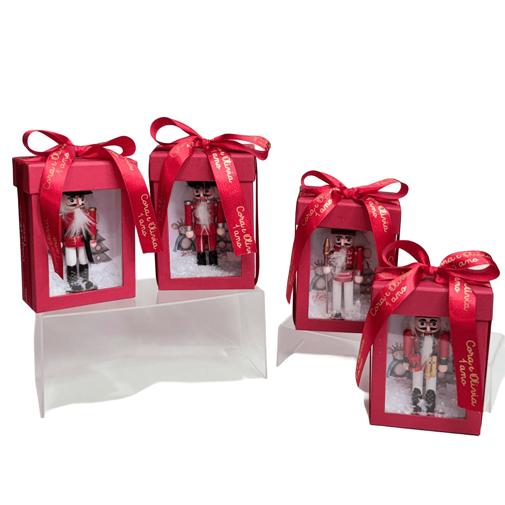 O Soldadinho (inspirado no Quebra-Nozes) é um presente clássico, transformado em uma lembrança de alto padrão. A peça é apresentada em uma Caixa Vitrine (Display Box) de cartonagem rígida, com uma janela transparente que realça a miniatura e a base temática (simulando neve, conforme a foto).